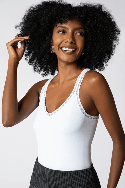 Blusa com renda confeccionada em tecnologia seamless que traz maior conforto e ajuste perfeito. Camisete regata com aplicação de renda no decote e cavas, com alças fixas. Com estrutura levemente canelada, proporcionando toque macio e suave, ideal para usar no seu dia a dia, externa ou mesmo como underwear. Um clássico essencial para o guarda-roupa.